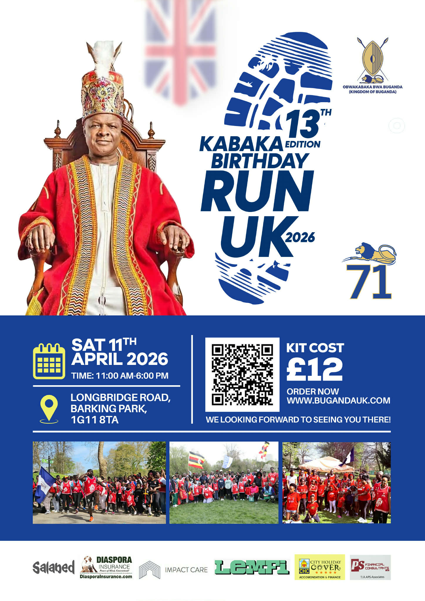 Kabaka at 71 is the 13th Kabaka’s Birthday Run in UK to celebrate the Kabaka of Buganda’s 71st Birthday while raising money towards the fight against HIV/AIDS in Buganda, and Uganda.