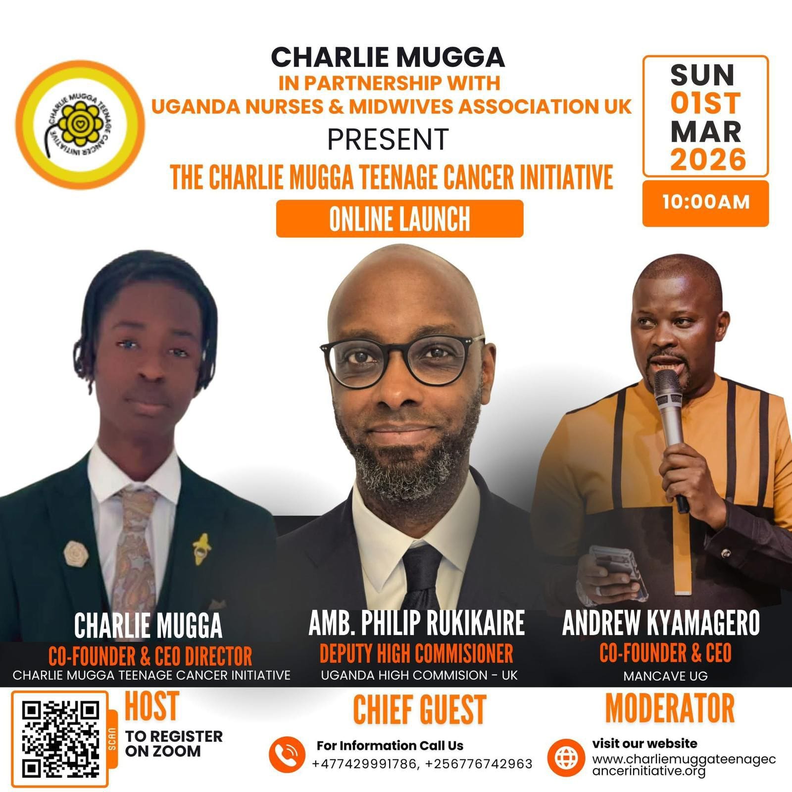 Please join us for the official launch of the Charlie Mugga Teenage Cancer Initiative in collaboration with Uganda Nurses and Midwives Association in the UK. The event will be hosted by Andrew Kyamagero, with the Chief Guest being H.E. Ambassador Philip Rukikaire, Deputy High Commissioner.