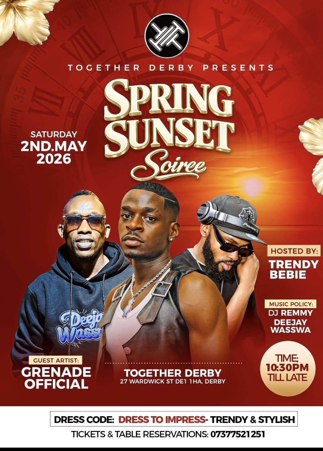 Get ready to kick-off your evening in style! Join us for an unforgettable night as we transform Together Derby club into an urban oasis with guest artist performances, including Grenade Official as the sun sets, our DJs; DJ Reemy and DJ Wasswa will turn up the heat with the best in AfroBeats, Amapiano, RnB, Dancehall and Urban while you sip on curated sunset cocktails. Whether you’re relaxing in our lounge, dancing or singing along, this is the ultimate spring vibes.