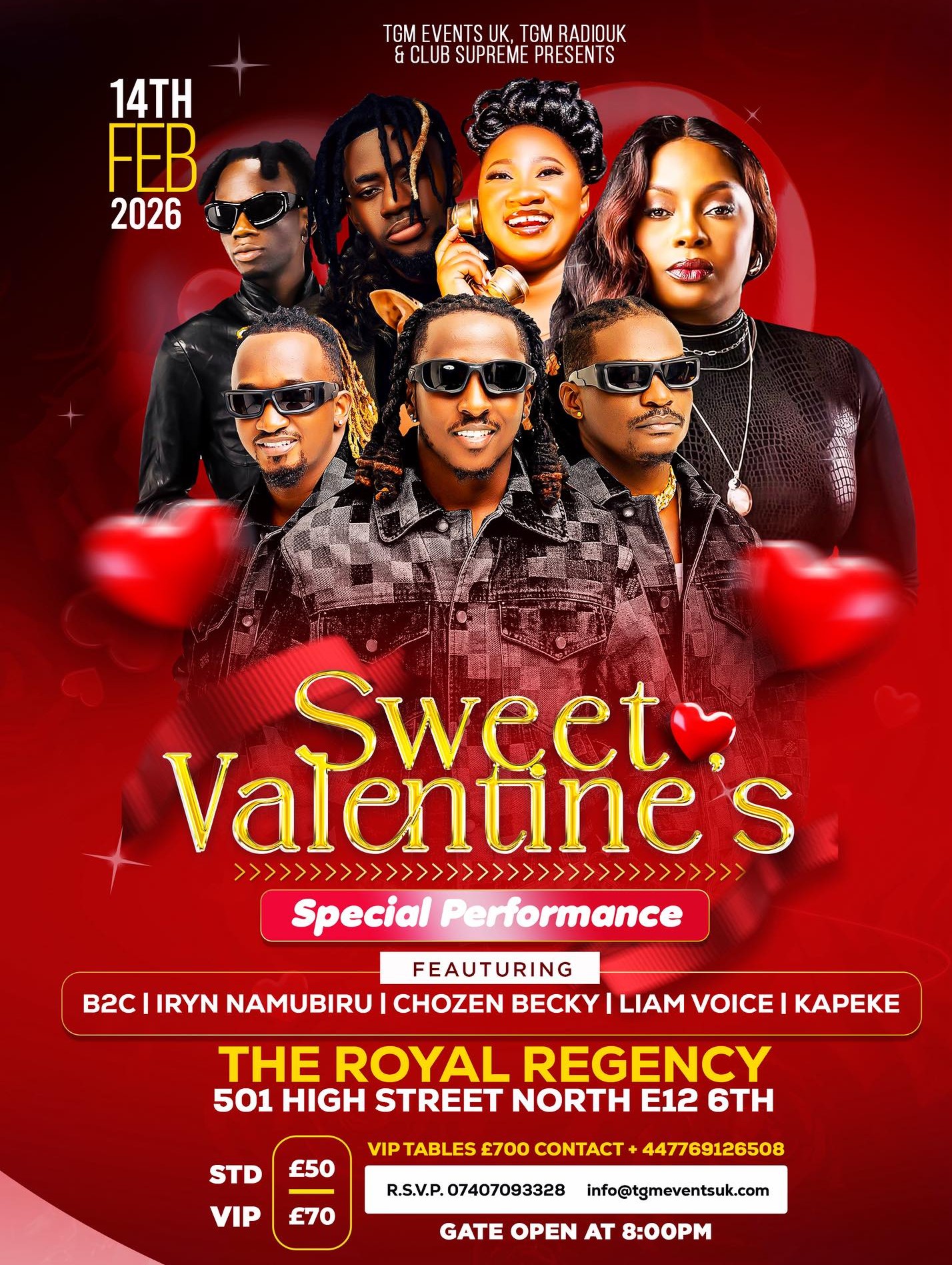 Sweet Valentine’s by TGM Events UK 19 19 people viewed this event. B2C, Iryn Namubiru, Chosen Becky, Liam Voice and Kapeke in a Valentines’ Day special performance in London Register for event To register for this event email your details to info@tgmeventsuk.com Register using webmail: Gmail / AOL / Yahoo / Outlook Date And Time 14-02-2026 | 08:00 PM to 15-02-2026 | 03:00 AM Location The Royal Regency, London Event Types Concert or Performance Event Category Music Event Share With Friends Facebook Twitter Linkedin Xing Pinterest